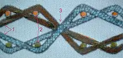 Na nákresu vpravo je schematicky znázorněn průřez tkaninou s osnovními nitěmi (1), útky (2) a drážkou (3), která vzniká účinkem trikotové vazby. [2]