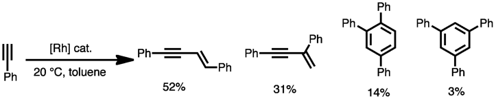 Kromě polymerů, dimerů a trimerů, vznikajících s nízkými regio- a chemoselektivitami, byly pozorovány také enynové vedlejší produkty vznikající dimerizacemi alkynů. K vytváření enynů bývají obzvlášť náchylné reakce katalyzované rhodiem.[9]