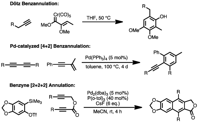 Dalšími způsoby přímé tvorby aromatických sloučenin ze substituovaných nenasycených prekurzorů jsou Dötzova reakce, palladiem katalyzovaná [4+2] benzanelace enynů alkyny,[19] a [4+2] cykloadiční reakce enynů s alkyny řízené Lewisovými kyselinami[20] a cyklizace benzynů alkyny, katalyzované palladiem.[21]
