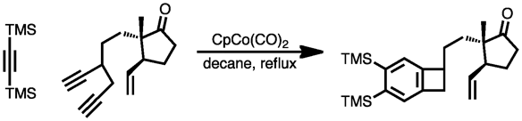 Cyklizacemi využívjícími substráty, které mají všechny nebo některé alkynové skupiny „připoutané“ k sobě, lze získávat molekuly obsahující polycykly. Přidání 1,5-diynu k alkynu vyvolá tvorbu benzocyklobutenu, který lze zapojit do dalších reakcí.[11]