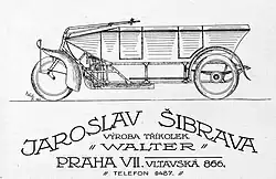 - ↑ a b c d e ŠIBRAVA, Jaroslav. Trimobil. 1. vyd. Praha-Holešovice: Jar. Šibrava, Továrna motor. vozidel, 1923. 17 s. S. 1–17.