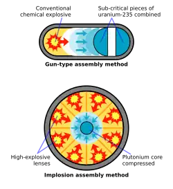 Plutonium získané z reaktoru však nebylo tak čisté jako plutonium získané z cyklotronu a přítomnost dalších isotopů vyústila v nepoužitelnost dosavadního puškového modelu. Tento problém byl vyřešen 17. června 1944[3] a vedl ke změně technologie zbraně na implosní zařízení, ve kterém sférické jádro plutonia bude stlačeno pomocí chemických výbušnin, což vedlo k zvýšení hustoty plutonia a vytvoření kritického množství. Sféra plutonia musela být stlačena na všech stranách stejně, chyba by vedla k selhání zbraně.