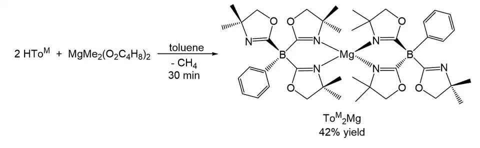 ToMMgMe je účinným prekatalyzátorem křížových dehydropárování vazeb Si-H u organosilanů a N-H vazeb aminů za vzniku vazeb Si-N a uvolnění H2.[2] Alkylované a amidované deriváty tris(oxazolinyl)borátu yttritého (ToMYR2) lze použít v cyklizacích aminoalkenů.[5]