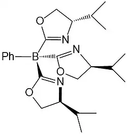 Další takové komplexy, například tris(4S-isopropyl-2-oxazolinyl)fenylborát (ToP), byly získány podobně.[3]