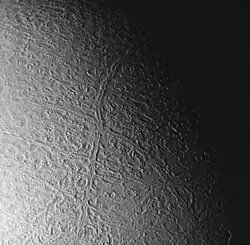 Na povrchu se také nacházejí spletité struktury tvořené hřbety a údolími, které vznikly pravděpodobně kvůli střídajícím se obdobím ochlazování a oteplování.[37] Mnoho z nich je také možná tektonického původu a mohlo vzniknout horizontálním zlomem nebo riftem.[38] Některé z nich vypadají jako hřbety na Europě a mohou tak mít stejný původ.[6] V rovníkové oblasti dlouhé zlomy se souběžnými pohořími vytvářejí rýhy.[38]