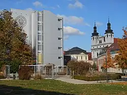 Trnavská univerzita: vlevo moderní budova nové univerzity, vpravo trnavská katedrála s jezuitskou kolejí Královské akademie.