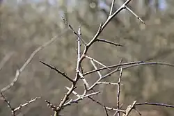 Na větvích se nacházejí trnovité výběžky tmavošedé barvy – kolce, vznikající přeměnou postranních větviček. Mladé větve jsou zelené a ochlupené. Později mají větve červenohnědou až tmavě šedohnědou barvu, jsou velice tvrdé a houževnaté. Pupeny jsou krátce brvité, kulovitého tvaru.[3]
