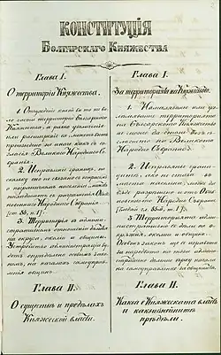 ![]() První stránka ústavy v ruštině a bulharštině | |