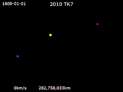 Druhým byl asteroid 2010 TK7, který se po vypočtení dráhy stal prvním trojánem Země. Jeho dráha je poměrně chaotická a označuje se jako „tadpole orbit“ (tadpole je anglicky pulec), tedy pulčí dráha. Obíhá v dráhové rezonanci 1:1 se zemí kolem slunce, ale na své dráze migruje (po tadpole orbitě) od bodu L4 až k bodu L3 a zpět. Celý cyklus mu trvá 390 let. Má poměrně velkou excentricitu e = 0,191, takže jeho vzdálenost od slunce se mění od 0,81 AU do 1,19 AU. Velký je i sklon dráhy 20,9°.