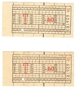- Jednoduché jízdné: Jízdenky tohoto typu byly prodávány pouze ve vozech trolejbusů a neumožňovaly přestup na tramvaje. Jízdné bylo pásmové, například linka W byla rozdělena na 4 pásma. Možnost přestupu mezi trolejbusy na tyto jízdenky byla umožněna až od 1. října 1948.