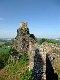Nižší sopouch s věží Baba převyšuje úroveň prvního nádvoří o 47 metrů.[12] Věž má šestiboký půdorys a interiér rozdělený příčkami na čtyři menší prostory. Vstupem v severní stěně se vcházelo do předsíně, ze které vedly vchody do dalších místností osvětlených velkými okny. Na vyšším skalisku (převýšení 57 metrů[12]) byla postavena čtverhranná věž Panna.[17] Původně měla mít přibližně čtvercový půdorys, ale poté, co byla postavena západní část se vstupním hrotitým portálem do výšky prvního patra, došlo k jejímu rozšíření o východní přístavbu. Přízemí věže vyrovnává velký výškový rozdíl terénu mezi starší a mladší částí. Obytné prostory se nacházely v prvním patře. Podoba oken je výsledkem rekonstrukce z první poloviny dvacátého století.[18]