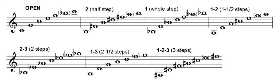 Schéma nahoře zobrazuje všechny dosažitelné tóny na trubku. Tóny v závorkách jsou o něco nižší než by měly být v rovnoměrně temperovaném ladění, zní falešně a hráči se jich snaží vyvarovat. Některé tóny jdou zahrát i více způsoby, například c² lze zahrát bez použití klapek (jako 4. harmonická frekvence) nebo jako 5. harmonická frekvence e² se stisknutou 2. a 3. klapkou (snížení tónu o 1 + 3 = 4 půltóny). Při současném stisku 1. a 2. klapky (2 + 1 = 3 půltóny) je intonace nástroje nepatrně vyšší, než při stisku samotné 3. klapky (3 půltóny).