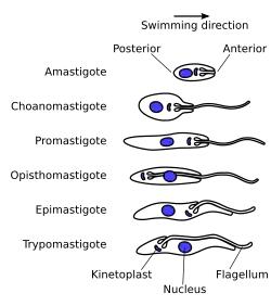 • promastigot – štíhlý s volným bičíkem na jedné straně, kinetoplast jsou před jádrem, toto stadium může také bičík ztratit a stát se amastigotem