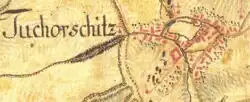 - Tuchořický zámek byl postaven v osmnáctém století,[23] ale dochovaná podoba pochází z 19. století.[24] Stavebně historický průzkum, který by případně odhalil starší části budovy, dosud nebyl proveden.