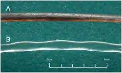 Hladký povrch vibrisů lachtana kalifornského (A) a vlnkovaný povrch u tuleně obecného (B)