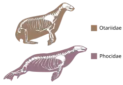 Schematické zobrazení základních anatomických rozdílů lachtanovitých (nahoře) a tuleňovitých