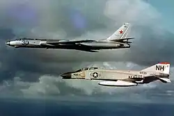 Průzkumný Tu-16 doprovázený stíhačkou F-4 Phantom II amerického námořnictva nad Tichým oceánem v roce 1963