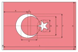Vlajka Turecka je tvořena červeným listem o poměru stran 2:3 s bílým půlměsícem a bílou pěticípou hvězdou, která se zvenku zhruba dotýká jedním cípem pomyslné spojnice dvou rohů půlměsíce a celý emblém je posunutý od středu kousek k žerdi.[1]