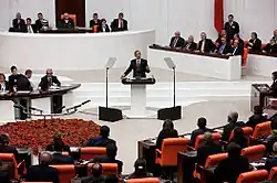 Aby se politická strana dostala do parlamentu, musí přesáhnout vysokou hranici 10 % volebních hlasů, což je hranice více než u jakékoli země Evropské unie. Některé malé strany nechávají své členy do voleb vstoupit jako nezávislé, protože když se do parlamentu dostanou, mohou se ke svým stranám znovu přihlásit.[163] Nejsilnějšími stranami v Turecku jsou středopravá konzervativní Strana spravedlnosti a rozvoje (AKP), která ve volbách roku 2011 získala téměř 50 % hlasů, středolevá kemalistická Republikánská lidová strana (CHP) s 26 % hlasů a ultrapravicová Strana národního hnutí se 13 % hlasů. Celkem 36 z celkového počtu 550 míst v parlamentu získali nezávislí, z nichž většina se později přihlásila k prokurdským stranám.[164]