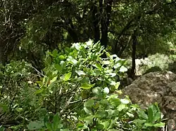 Typická vegetace je sklerofylní a xerofilní, protože musí odolávat letnímu suchu. (Sklerofyl je druh vegetace, který je přizpůsoben dlouhým obdobím sucha a tepla. Rostliny se vyznačují tvrdými listy, krátkými intermodii). Dominantním druhem je dub pýřitý. Podrost je dřevnatý, trnitý a aromatický, s druhy jako keře dávající mastichu, řešetlákem proměnlivým, četnými liánami jako je přestup drsný, a na mýtinách se rostou cisty, rozmarýn a tymián. Ve stromovém patře se vyskytují druhy jako borovice halepská a borovice pinie, jalovec chvojka, planika obecná atd. Na vlhčích místech se objevuje dub portugalský, na křemičitých půdách dub korkový.