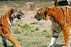 - Tygr ussurijský, též tygr sibiřský, tygr amurský, tygr korejský, tygr mandžuský či tygr severočínský (P. t. altaica); jeden ze dvou největších tradičních poddruhů tygra byl kdysi rozšířen v rozsáhlých oblastech východní Sibiře, Mandžuska a Koreje. Srst je světlejší, dlouhá a hustá.[11] Kvůli masivnímu pronásledování byla populace v polovině 20. století zredukována na sotva 30 jedinců žijících v pohraničních oblastech na rusko-čínské a čínsko-korejské hranici. Díky záchranným programům se však naštěstí podařilo zvýšit stav populace tygra ussurijského na současných zhruba 350 až 400 divoce žijících jedinců. Je však stále považován za velmi ohrožený.[12]