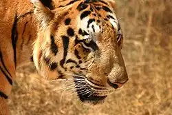 - Tygr indický, též tygr bengálský či tygr královský (P. t. tigris); s tygrem ussurijským se řadí k největším tygrům. Barva srsti je proměnlivá, většinou je však srst tmavší než u tygra ussurijského a světlejší než u tygrů z jihovýchodní Asie. Pruhy jsou obvykle velmi tmavé. Původně byl rozšířen od údolí Indu v Pákistánu na západě přes celý indický subkontinent až do severozápadní Barmy na východě.[15] Přitom v rámci populace existuje jistá genetická variabilita, především tygři žijící v severních oblastech výskytu se liší od ostatních indických tygrů. Tygři v západních oblastech výskytu vykazují naopak značnou vzájemnou genetickou příbuznost. Například jedinci z národního parku Sariska, kde tygr v roce 2004 vyhynul, byli geneticky velmi blízcí tygrům z nedalekého národního parku Ranthambore. Tygři z Ranthambore jsou tedy ideálními kandidáty pro možné budoucí znovuvysazení v Sarisce.[16] Dnes se tygr indický vyskytuje v izolovaných oblastech Indie, Bangladéše, Bhútánu, Nepálu a západní Barmy. Počet divoce žijících jedinců je odhadován na 2 500, z toho podstatná část, zhruba 1 400, žije v Indii (odhad z roku 2008). Výrazný rozdíl proti podstatně vyšším počtům udávaným po dřívějším sčítání v letech 2001-2002 je důsledkem odlišných metod sčítání, obě čísla tedy nelze přímo srovnat. Pozdější součty jsou však považovány za věrohodnější.[17] Tygr indický je klasifikován jako ohrožený, nicméně jeho situace je lepší než u ostatních tradičních poddruhů. Ochranářské organizace však stále nepřestávají varovat před nebezpečím vyhynutí tygra v Indii a okolních státech. Jedním z důvodů je to, že i přes přísný mezinárodní zákaz kriminální organizace stále provozují rozsáhlý černý trh s tygřími kůžemi.