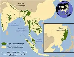 Jednotliví tygři jsou schopní urazit dlouhou cestu, je proto nutné rozlišovat mezi oblastmi trvalého výskytu a oblastmi, kam nějaký tygr pouze příležitostně zabloudí. I v oblastech, kde člověk tygra vyhubil, se občas vyskytne putující jedinec.[35]