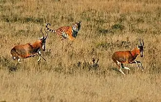 - ↑ FÀBREGAS, María C.;, FOSGATEA, Geoffrey T.; KOEHLER, Gary M. Hunting performance of captive-born South China tigers (Panthera tigris amoyensis) on free-ranging prey and implications for their reintroduction. Biological Conservation. December 2015, roč. 192, čís. 4, s. 57–64. Dostupné online.