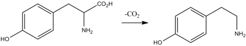 V laboratoři může být tyramin syntetizován různými způsoby, zejména také dekarboxylací tyrosinu.[22][23][24]