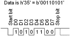 USART vysílá data na pinu označovaném obvykle jako TX (transmit), přijímá na pinu RX (receive). Klidová úroveň signálu je log. 1 (pokud neprobíhá vysílání ani příjem). Vysílání je zahájeno změnou hodnoty signálu na log. 0 po dobu jednoho bitu (tzv. start-bit). Následovně se posílá nejnižší datový bit, poslední nejvýznamnější datový bit je následován stop bitem, který má opět úroveň log. 1. Po odvysílání stop-bitu může začít přenos dalšího bajtu. Na obrázku je to vyznačeno tečkovaně.