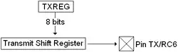 Jakmile jsou data zapsána do registru TXREG, všechny bity jsou přepsány do registru pro vysílání (Transmit Shift Register). A odtud jsou dále přeposlány na TX pin, přičemž je jim přiřazen na začátek start a na konec stop bit. Použití speciálního registru pro vysílání umožňuje načítání nových dat do registru TXREG už během vysílání dat předchozích. To maximálně zefektivňuje komunikaci.