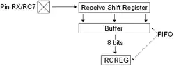 Po detekci start bitu na pinu RX, se další data bit po bitu přesunou do registru pro příjem (receive shift register). Po přesunutí posledního bitu se zkontroluje stop bit a data se pošlou do bufferu, který je předá registru RXREG, pokud je prázdný. Tento buffer a registr RXREG jsou dva elementy FIFO. Separátní použití registru pro příjem a FIFO bufferu poskytuje softwaru bežícímu na PICmicro® MCU čas k přečtení doručených dat bez rizika přepsání těchto dat dalšími doručenými. Je tedy možné obdržet první dva bity a dále přijímat třetí bite ještě předtím, než jsou data „vytažena“ z registru RXREG.