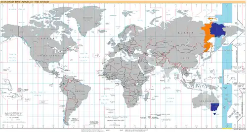 - Austrálie — letní čas platný[p 6] na části území (Nový Jižní Wales,[p 7] Tasmánie, Teritorium hlavního města Austrálie, Teritorium Jervisova zátoka a Victoria) posunutý o hodinu oproti standardnímu času