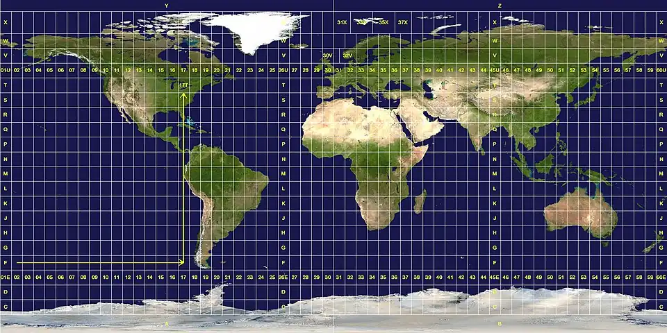 Oblast se zeměpisnou šířkou mezi −80° a +84° je rozdělená na 20 rovnoběžkových zón po 8° označených od jihu k severu písmeny C až X. Písmena I a O jsou vynechaná kvůli jejich podobnosti s číslicemi 1 a 0. Zóna X je rozšířená o 4° na sever, takže pokrývá oblast mezi +72° a +84°. Polární oblasti pokrývají zóny A, B (západní, resp. východní část Antarktidy) a Y, Z (západní, resp. východní část Arktidy).