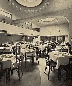 Prvorepubliková restaurace vznikla v tehdy novém objektu[2] a sídlila na nároží pasáže v ulici Na Poříčí 26.[3] Ve stejném průchodu působilo také Divadlo E. F. Buriana (od přelomu 20. a 21. století Divadlo Archa).[2] V restauraci udržující si tradici zájezdního hostince byl ve dvacátých letech 20. století v provozu také kabaret a šantán. Na konci 80. let téhož století měl podnik formu samoobslužné restaurace, bufetu a vinárny o kapacitě 50 návštěvníků. Zájemci mohli též využít drůbežího grilu.[3] Prostory bufetu prošly roku 1993 rekonstrukcí a i nadále fungovaly tácovým systémem (jídlo si strávník dává na svůj tác, následně jej u pokladny zaplatí a pak odnese ke stolu, kde je zkonzumuje).[4]