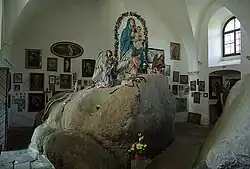 Podle tradice se tu na velkých balvanech kolem roku 1500 zjevila Panna Maria s Ježíškem. Odtud název "Svatý kámen". Kámen, na němž Madona seděla, se prý později rozpůlil na znamení pravdivosti zjevení a dvě části se mají od sebe vzdalovat. Až budou kameny od sebe vzdáleny tak, že tam projede vozka z koněm, má nastat soudný den.