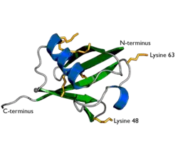 Ubiquitin je 76 aminokyselin dlouhý, kompaktní protein[4]. Jedná se o jeden z nejvíce konzervovaných eukaryotických proteinů[5].