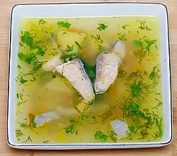 - carská ucha (místo rybího vývaru se používá kuřecí, přidávají se krevety,nakonec se zjemní máslem a posype šafránem kvůli zlatavé barvě)