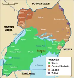 Uganda je vlastí mnoha různých etnických skupin, z nichž žádná nemá většinu. Nejpočetnější jsou kmeny Ganda a Karamodžong. Hovoří se zde přibližně 40 různými jazyky. Po osamostatnění Ugandy se stala angličtina úředním jazykem. Jazykem s nejvyšším počtem mluvčích je luganda, jímž se hovoří v Bugandě. V dalších oblastech Ugandy se hovoří místními kmenovými jazyky (na severu Ugandy je to např. jazyk Lacholi, patřící ke kmenu Acholi).[zdroj?]