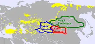 - ↑ ve spojení s Oguzskými Turky a pak s Karluky, se jejich jazyk smíchal s oguzštinou, a později, v mongolském období nabyl formy čagatajského jazyka pojměnovaného podle Čagataj-chána