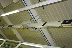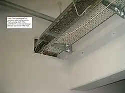 - Uložení v kabelových žlabech. Na výložnících, konzolách nebo závěsech jsou připevněny otevřené drátěné žlaby nebo plechové žlaby s víkem. Použije se tam, kde je třeba vést větší počet kabelů nebo kabely velkých průřezů. Výhodou drátěných žlabů je snadné odbočování a lepší chlazení kabelů. Ohyby žlabů lze snadno vytvarovat po nastřižení drátů a ohnutí přímo při montáži. Nevýhodou drátěných žlabů je znečištění kabelů prachem a nemožnost elektromagnetického stínění datových a sdělovacích kabelů. Plechové žlaby vyžadují pro změnu směru další prvky (rohy, T-kusy) a odbočení kabelů na trase je obtížné. Dobře ale chrání kabely pře znečištěním a poskytují kvalitní stínění.