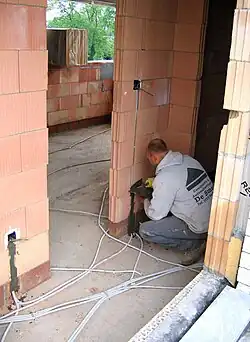 - Kabely jsou příchytkami upevněny na neomítnutou zeď nebo uchyceny v drážce vysekané do omítky. Používají se silové kabely s dvojitou izolací. V Česku je oblíbený kabel s označením CYKY, obdoba německého NYM. Před omítnutím stěny musí být uloženy všechny kabely a instalační krabice a kabely zataženy do krabic.