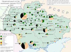 Národnostní požadavky byly v prvním období Sovětského svazu plněny poměrně dobře. V rámci programu zvaného korenizacija (někdy překládáno jako indigenizace) byly podporovány národní jazyky a kultury. Program ukrajinizace řídil zejména Mikola Skripnik. Avšak národně orientovaní politici byli ve 30. letech zhusta zlikvidováni ve Stalinových čistkách jako „buržoazní nacionalisté“. Skripnik raději spáchal sebevraždu, aby se zinscenovanému procesu vyhnul. Jeho kolega a vůdce ukrajinských komunistů Stanislav Kosior však popravě neunikl. Na konci 30. let již byla korenizacija jednoznačně nahrazena rusifikací. V roce 1938 se ruština například stala povinným předmětem studia na všech neruských školách.[48] Etnické napětí tak vzrostlo. Česká menšina, která žila na Ukrajině a která byla podporována československou vládou a evangelickou církví, byla pronásledována.[49][50]