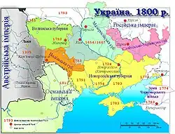 Koncem 18. století byla také zlikvidována tatarská a turecká moc na jihu a carevna Kateřina II. Veliká a její rádce kníže Potěmkin založili v nově dobyté tzv. Nové Rusi několik významných měst: Oděsu, Jekatěrinoslav, Sevastopol a mnoho dalších. Kateřina II. rovněž pozvala na ukrajinská území, zejména na Krym, řadu migrantů z Německa, ale i Bulharů, Srbů a Řeků.[39]