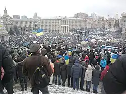 Pouhý den poté, v pátek 22. listopadu 2013, zaplavila Kyjev a část Ukrajiny vlna demonstrací. Před Vánoci 2013 se na největší manifestaci na hlavním kyjevském náměstí Majdan sešlo na 200 000 lidí,[65] podle britských zdrojů to mělo být až 800 000 demonstrantů.[66][67] Poté se série protestů, která je známá pod názvem Euromajdan, přenesla i do některých dalších ukrajinských měst. V prosinci 2013 odmítla Evropská komise, což je exekutivní orgán EU, poskytnout Ukrajině finanční pomoc ve výši několika miliard eur výměnou za podpis asociační dohody.[68] Situace eskalovala v průběhu vládních represí vůči demonstrantům. Od února 2014 již nepokoje přerostly ve velké ozbrojené střety mezi policií a demonstranty. Prezident Janukovyč a jeho vláda sice za účasti ministrů zahraničí Německa a Francie vyjednávali s opozicí, přičemž bylo dosaženo dohody o předčasných prezidentských volbách ještě v roce 2014. Tato dohoda se však poté, co bylo použito zbraní proti demonstrantům, stala bezpředmětnou a dne 22. února 2014 uprchl prezident Janukovyč s pomocí Ruska ze země.