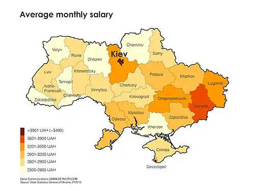- ↑ Ukrstat – Середня заробітна плата за регіонами за місяць у 2008 році. Přepočet na USD dle oficiálního kurzu Národní banky Ukrajiny Archivováno 30. 9. 2019 na Wayback Machine..