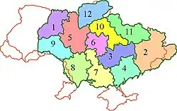 Správní členění Ukrajinské SSR roku 1921 a dnešní hranice Ukrajiny (červeně)