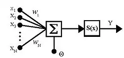 První umělé neurony byly vytvořeny Warrenem McCullochem a Walterem Pittsem v roce 1943.[7] Tyto neurony fungovaly tak, že byl jejich výstup 0 nebo 1 v závislosti na tom, jestli vážená suma vstupních signálů překročila prahovou hranici, nebo ne. Jejich teorie byla, že takový neuron v principu spočte jakoukoli aritmetickou či logickou funkci. Tehdy však nebyla vypracována žádná tréninková metoda.