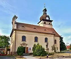 Před kostelem stojí sochy svatého Václava a svatého Jana Nepomuckého, fara (čp. 7), bývalá škola (čp. 8) s barokními štíty a bývalá lékárna čp. 3 s renesančním portálem.