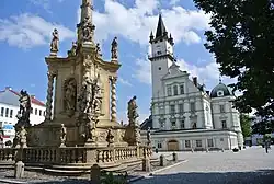 Historické centrum města bylo v roce 1992 vyhlášeno městskou památkovou zónou.[19] Uprostřed centrálního Masarykova náměstí se nachází radnice s arkádovým schodištěm a dominantní věží, původně středověká tržní budova byla v roce 1891 přestavěna do dnešní neorenesanční podoby. Severně od radnice stojí monumentální barokní mariánský sloup se sochou Panny Marie Immaculaty, dokončený roku 1743, a kašna se sochou orla. Na jižní straně náměstí je druhá barokní kašna osazená sochou Neptuna. Historické jádro města je zastavěno řadou renesančních a barokních měšťanských domů, nachází se zde i několik sousoší a křížů. Novogotický Millerův dům slouží jako budova městského úřadu. Z části se také dochovalo původní opevnění města s několika baštami a Medelskou bránou.